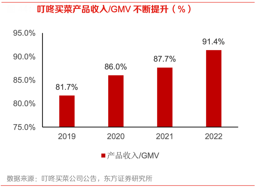 經典案例:根據叮咚買菜公司公告、東方證券研究所等綜合資訊表明,在 GMV 向收入的有效轉化方面,叮咚買菜減少無效的優惠券發放,更多集中于 綠卡會員優質用戶的優惠券營銷,從而提高收入端的增長。2019 年至2022年叮咚買菜產品收入/GMV 比例提升近 10 個百分點,可見優惠券的發放力度在不斷減小。