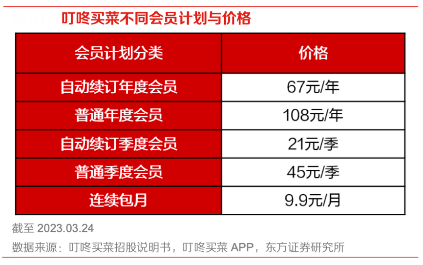 經(jīng)典案例:根據(jù)叮咚買菜招股說明書、叮咚買菜APP、東方證券研究所等綜合資訊表明,叮咚買菜設(shè)置不同的會員計劃與價格,能夠滿足不同消費(fèi)者的差異化需求。9.9 元連續(xù)包月吸引未開通長期綠卡會員的用戶,通過提高用戶的體驗度來為長期會員計劃引流,從而提高用戶粘性。