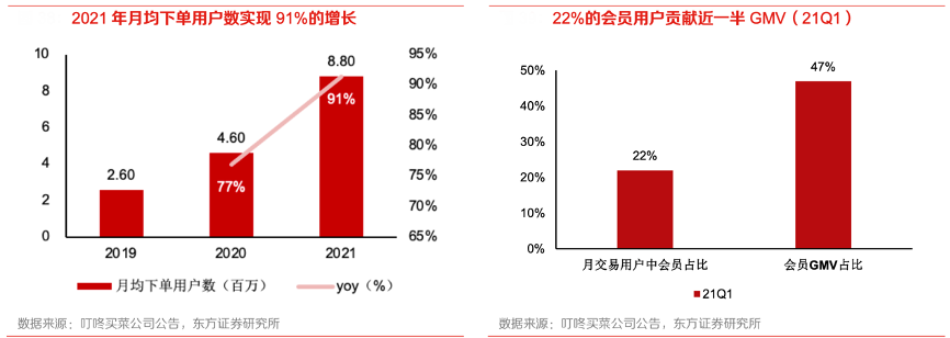 經(jīng)典案例:根據(jù)叮咚買菜公司公告、東方證券研究所等綜合資訊表明,趨勢對比來看,叮咚買菜 2021 年月均下單用戶突破 880 萬,同比實(shí)現(xiàn)了 91%的增長?;跁T群體具有高價值和稀缺性 的屬性,其訂單貢獻(xiàn)量遠(yuǎn)高于普通用戶。2021Q1 叮咚買菜會員用戶占總用戶比例 22%,貢獻(xiàn)了 47%的 GMV。