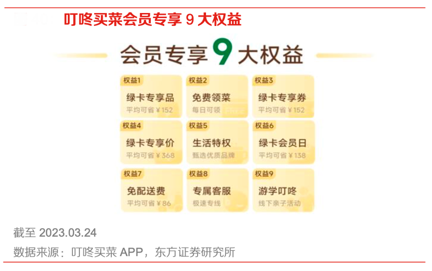經典案例:根據叮咚買菜APP、東方證券研究所等綜合資訊表明,綠卡用戶作為叮咚買菜核心用戶的重要性顯而易見,為了刺激用戶開通會員,保持對平臺的粘性,叮咚買菜力推綠卡會員制度。綠卡會員專享 9 大權益:綠卡專享品、免費領菜、綠卡專享券、綠卡專享價、生活特權、綠卡會員日、免配送費、專屬客服、游學叮咚。