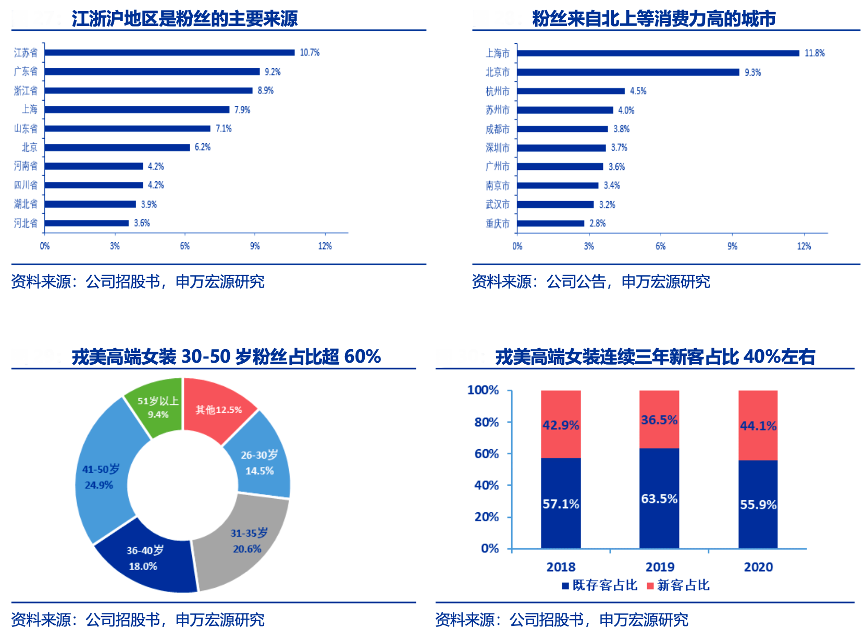 經典案例:根據公司招股書、公司公告、申萬宏源研究等綜合資訊表明,截至 2020 年 12 月 31 日戎美高端女裝粉絲各年齡段均有分布,其中 30-50 歲“輕熟”、“知性”女性占比超 60%。粉絲主要分布于華東、華北和華南等消費人口較多、經濟較為發達地區。江浙滬三地占比超過 25%,按城市劃分,上海是最大的粉絲來源地,粉絲占比超 10%。