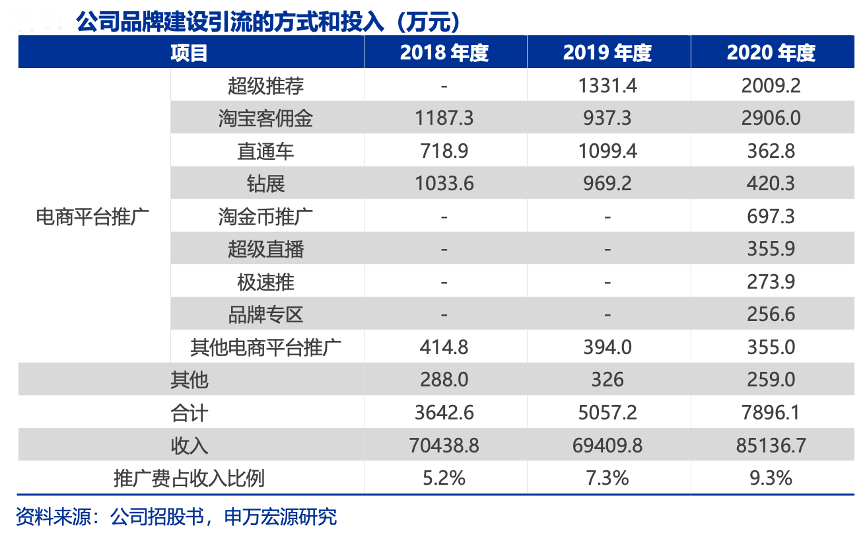 經典案例:根據公司招股書、申萬宏源研究等綜合資訊表明,戎美公司積極跟進淘寶各類營銷活動,參與直通車、超 級推薦、鉆展等活動均取得良好效果,新增淘金幣、超級直播、極速推和品牌專區等活動。2018-2020年,公司超級推薦及淘寶客傭金呈增長之勢。