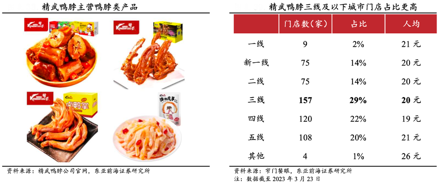 經(jīng)典案例:根據(jù)精武鴨脖公司官網(wǎng)、東亞前海證券研究所、窄門餐眼等綜合資訊表明,精武鴨脖成立于 1991 年,主要經(jīng)營休閑鴨脖類產(chǎn)品,截至 2023 年 3 月 23 日,其在全 國范圍內(nèi)已有 548 家門店,覆蓋了全國 30 個省份和 189 個城市。其中湖州、武漢和杭州為門店數(shù)量最多的城市。精武鴨脖的平均客單價在 20 元左右,顯著低于鹵味龍頭企業(yè) 30+元的客單價水平。