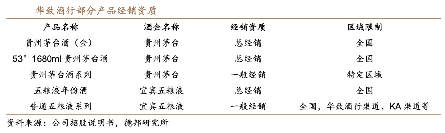 經典案例:根據公司招股說明書、德邦研究所等綜合資訊表明,華致酒行名酒資源豐富,擁有 53°1680ml 貴州茅臺酒、貴州茅臺酒(金)、五糧液年份酒的總經銷資質以及普通五糧液系列、貴州茅臺酒系列的一般經銷資質,而且與汾酒、古井貢、釣魚臺、荷花、習酒等知名酒企保持戰略合作。對于零售網點來說,名酒配額是稀缺的,也是維持客戶粘性的重要產品,華致的“名酒配額”正好迎合了零售網點對名酒的需求。
