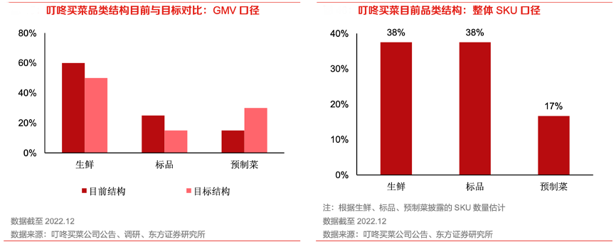 經(jīng)典案例:根據(jù)叮咚買菜公司公告、調(diào)研和東方證券研究所等綜合資訊表明,無論是在 GMV 還是 SKU 口徑下,叮咚買菜的品類結(jié)構(gòu)中生鮮均占主導(dǎo)地位。