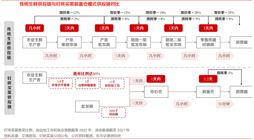 經(jīng)典案例:根據(jù)艾瑞咨詢、叮咚買菜公司公告、公開資料整理和東方證券研究所等綜合資訊表明,叮咚買菜直采可以直接減少各環(huán)節(jié)加價(jià),通過平臺(tái)直采,一方面大訂單對(duì)于上游的議價(jià)能力上升,另一方面可以有效減少各環(huán)節(jié)加價(jià),從而獲得更大的毛利空間。
