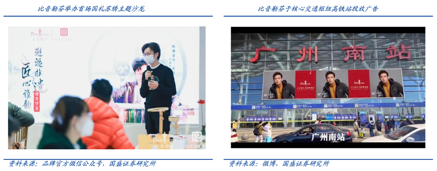 經典案例:根據贏商大數據、wind、微信、品牌官方微信公眾號、微博、國盛證券研究所等綜合資訊表明,作為以高爾夫為品牌基因、以中高端商務客群為核心目標用戶的品牌,比音勒芬公司并沒有采用傳統服飾品牌偏好的流量明星代言的思路,而是針對品牌形象及核心客群進行精準營銷,具體包括贊助高爾夫相關賽事、合作國家高爾夫隊、在機場及高鐵站投放廣告、登陸權威 媒體等。