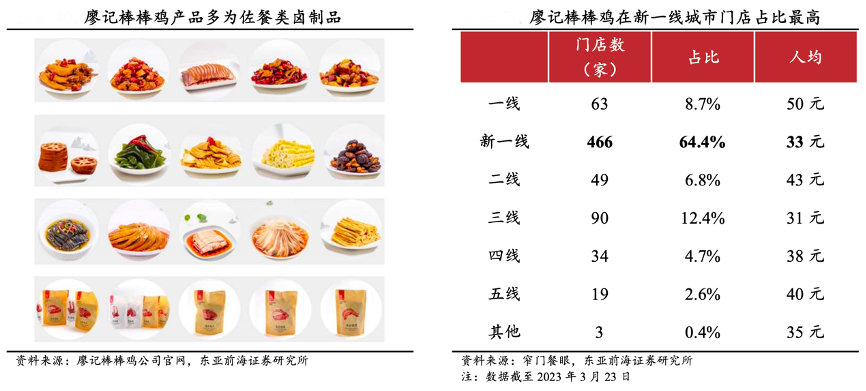 經典案例:根據廖記棒棒雞公司官網、窄門餐眼、東亞前海證券研究所等綜合資訊表明,廖記棒棒雞于 1993 年創立,以選材地道,烹飪考究,口感麻、辣、鮮、香而深受消費者喜愛,產品多為佐餐類鹵制品。截至 2023 年3 月 23 日,廖記棒棒雞在全國擁有 724 多家連鎖店,遍布 30 個省,92 座城市, 在新一線城市門店占比最高。