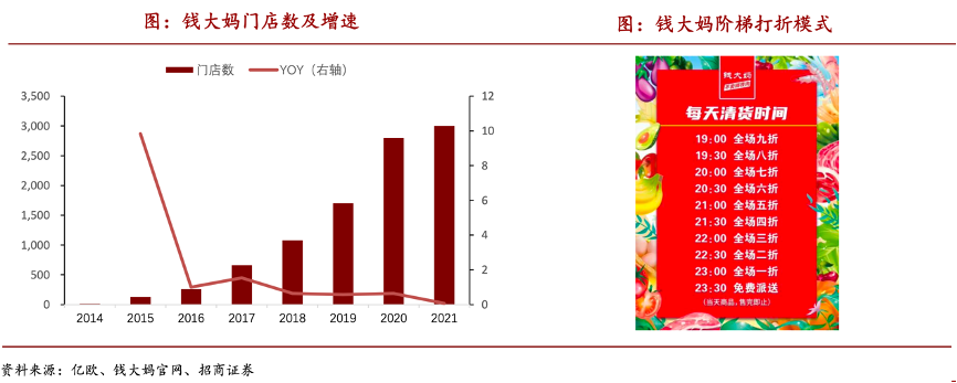 錢大媽以“不賣隔夜肉”為經營理念,契合老年人對新鮮生鮮食品的需求。錢大媽采用定時打折清貨模式,每天19:00開始自動打折促銷,每隔半小時再低一折,23:30后免費配送。