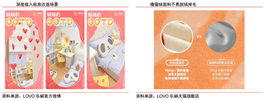 經典案例:根據LOVO樂蝸官方微博、LOVO樂蝸天貓旗艦店、中信證券研究部等綜合資訊表明,LOVO 樂蝸開啟“臥室改造計劃”,線上征 集“樂蝸女孩”,提供四件套、春秋被、抱枕、羊毛毯等產品,幫助報名的獨居女孩改造 臥室,通過綁定租房改造場景,突出舒適美觀的床品在租房生活中帶來的滿足感以及安全感。