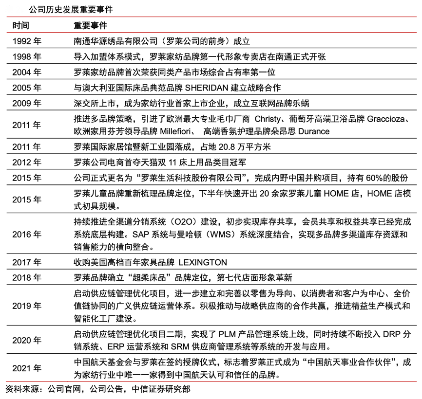 經典案例:根據公司官網、公司公告和中信證券研究部等綜合資訊表明,羅萊公司 1998 年在業內率先推出加盟體系模式,2004 年首次登頂同類產品市場占有率第一位并保持至今。公司持續推進多品牌戰略,2021 年公司進一步加強定位“羅萊超柔床品”,并簽約成為“中國航天事業合作伙伴”, 成為家紡行業中唯一一家得到中國航天認可和信任的品牌。