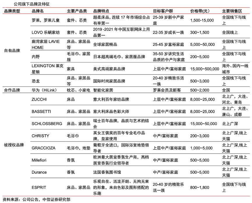 經典案例:根據公司公告、中信證券研究部等綜合資訊表明,羅萊公司成立于 1992 年,主要業務為以床上用品為主的家用紡織品的研發、設計、生產、以及銷售,主要產品包括寢具、芯類、生活家居 品等。公司通過打造自有品牌、聯合合作品牌、以及簽約代理品牌,實現了市場的錯位布 局,目標客戶群體廣泛。其中羅萊、羅萊兒童主品牌主打中高端消費。