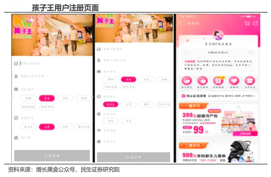 經(jīng)典案例:根據(jù)增長黑盒公眾號(hào)、民生證券研究院等綜合資訊表明,截至目前,孩子王公司已搭建起由 APP、小程序、微商城、云 POS 等線上平臺(tái)構(gòu)成的用戶前端系統(tǒng),實(shí)現(xiàn)了從線下數(shù)字化門店到線上平臺(tái)的全渠道互通,客戶可以在任何時(shí)間、任何地點(diǎn)、任何場景都能享受到優(yōu)質(zhì)的服務(wù)。此外,公司在服務(wù)過程中借助大數(shù)據(jù)采集用戶信息,建立起超 400 個(gè)基礎(chǔ)用戶標(biāo)簽和 1000 多個(gè)智能模型,實(shí)現(xiàn)廣告和信息的精準(zhǔn)投放,賦能公司業(yè)務(wù)發(fā)展。