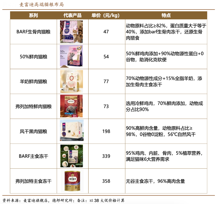經(jīng)典案例:根據(jù)麥富迪旗艦店、德邦研究所等綜合資訊表明,乖寶寵物公司自有品牌麥富迪逐步從大眾化向高端化躍進,產(chǎn)品實現(xiàn)中端(營養(yǎng)森林系列等)、中高端(barf 生骨肉系列、益生菌系列等)和高端(弗列加特系列等)全覆蓋;公司代理品牌 K9 Natural 和 Feline Natural 則定位高端市場,犬貓主糧產(chǎn)品單價基本超 500 元/kg。