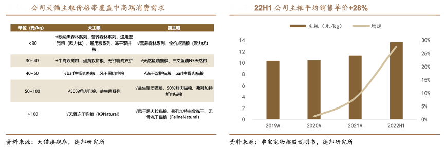 經(jīng)典案例:根據(jù)天貓旗艦店、乖寶寵物招股說明書、德邦研究所等綜合資訊表明,乖寶寵物公司自有品牌持續(xù)豐富價位段布局,雙拼、營養(yǎng)森林系列定位大眾化需求,受益于高鮮肉糧、處方糧等價格較高的高端產(chǎn)品以及弗列加特系列產(chǎn)品的熱銷,公司主糧銷售價格有所提升,22H1已提升至 13.6 元/kg。