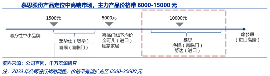 經典案例:根據公司官網、申萬宏源研究等綜合資訊表明,慕思股份自 2004 年成立之初即深耕內銷,2019-2021年境內主營收入占比均高于 97%。公司產品定位中高端市場,主力產品終端定價 8000-15000 元,高于其他本土品牌的中端價格定位,與舒達、絲漣等國際品牌處于同一價位。