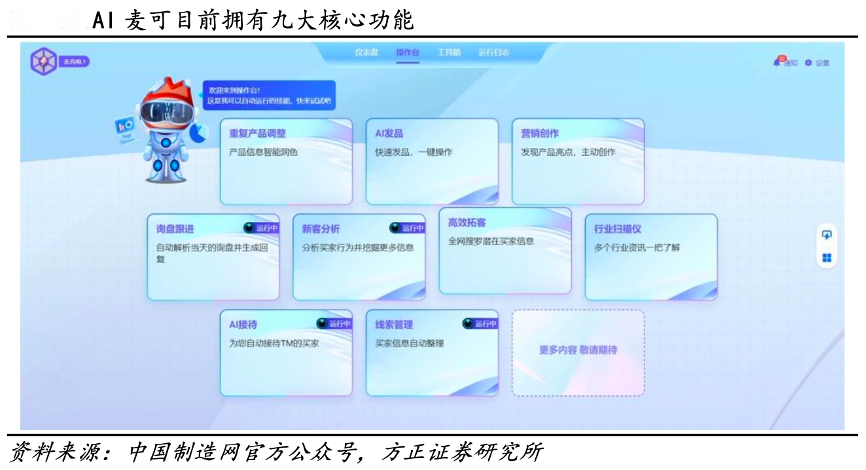 經典案例:根據中國制造網官方公眾號、方正證券研究所等綜合資訊表明,焦點科技公司 AI 麥可目前擁有九大核心功能,已覆蓋包含營銷推廣、品牌出海及采購洽談的外貿交易全場景:1) 營銷推廣場景,可實現從市場洞察到營銷文案的綜合產出,多場景撰寫外貿專 業開發信、智能改寫產品描述,并實時進行 SEO 檢測和優化提醒;2)品牌出海 場景,可實現從企業品牌形象打造、社媒貼文創意策劃、Blog 自動生成等功能 驅動品牌內容生產自動化;3)采洽溝通場景,可智能提煉買家的訴求和關鍵點, 并實現對話內容的多語種翻譯,貼合不同對話場景進行自動回復。