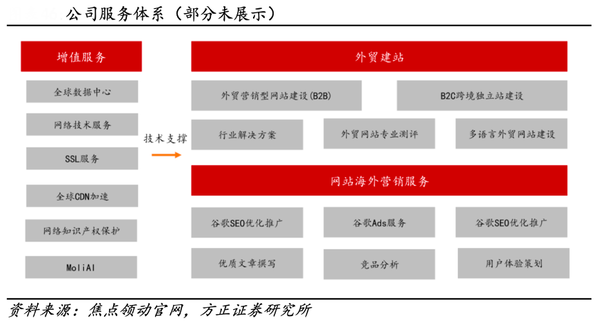 經典案例:根據焦點領動官網、方正證券研究所等綜合資訊表明,焦點領動是一家專注為中小企業提供云建站、云營銷服務的創新型 高科技技術企業,由焦點科技領動事業部于 2016 年底整體改制而成。截止目前, 領動云平臺銷售渠道已覆蓋中國 300 余個城市,支持 100 種以上小語種建站, 企業用戶超過萬家,平臺使用人數超過十萬人。