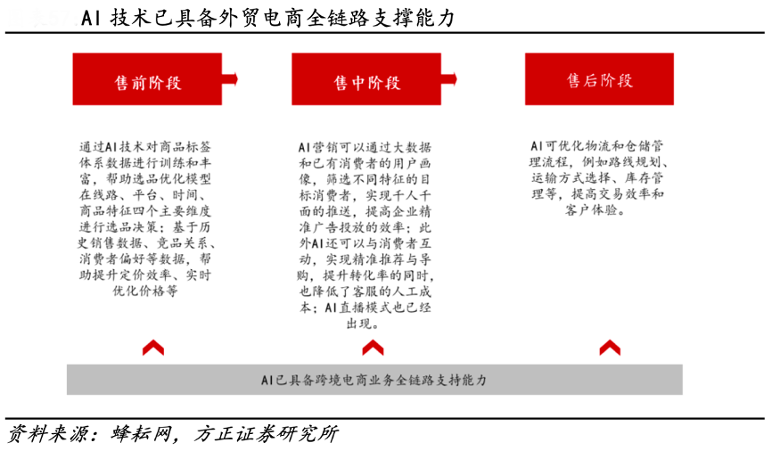 經典案例:根據蜂耘網、方正證券研究所等綜合資訊表明,較其他距消費者較遠的領域,電商直接觸達終端消費,AI 應用場景簡單直接。且電商天然擁有大量數據,AI可迅速完整被訓練,更快提供適配性服務。目前 AI麥可已能做到賦能電商全鏈路,實現 售前、售中、售后的智能化管理運營。