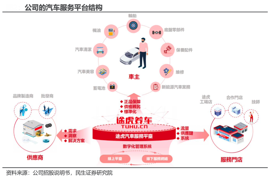 經典案例:根據公司招股說明書、民生證券研究院等綜合資訊表明,途虎是中國知名的獨立汽車服務品牌,已建成中國最大的汽車服務門店網絡 (以經營門店數量計)。公司從最早期純粹的在線零售平臺起家,通過線上+線下一體化的模式,提供高質量和標準化的服務。其通過線上“途虎養(yǎng)車”APP 和線下“自營途虎工場店”“加盟途虎工場店”以及合作門店 3 種類型的服務門店,打造出一個聯通了包括車主、供應商、服務門店等在內的綜合汽車服務平臺。