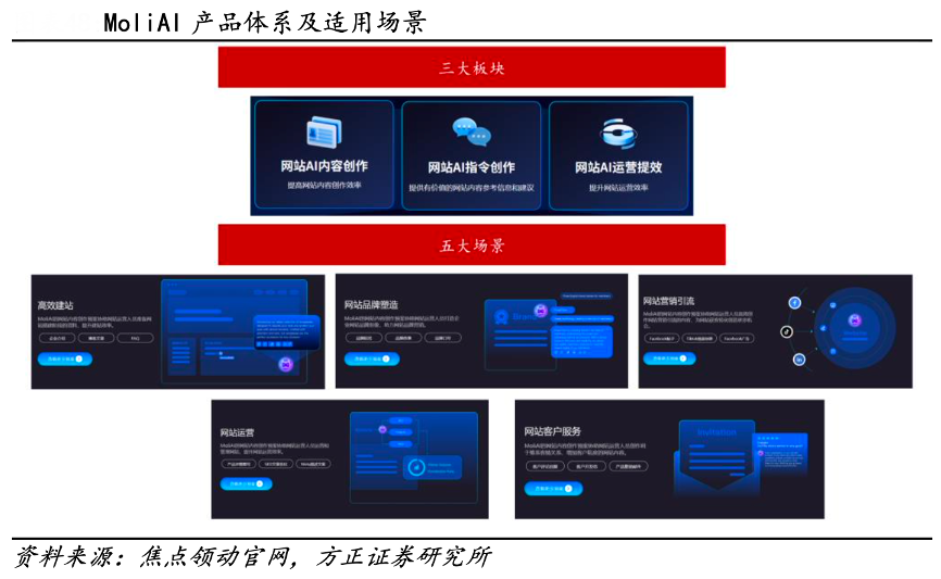 經典案例:根據焦點領動官網、方正證券研究所等綜合資訊表明,焦點科技自研人工智能“MoliAI”,深度適配外貿建站需求。MOliAI 基于跨境貿易企業網站建設和運營需求,預設了 70+實用的網站內容創作預案,覆蓋了高效建站、網站品牌塑造、網站運營、網站營銷引流、網站客 戶服務 5 大網站應用場景,深度適配外貿建站實際應用場景。