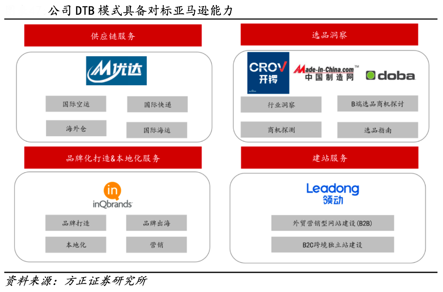 經典案例:根據方正證券研究所等綜合資訊表明,焦點科技公司已可滿足跨境貿易企業不同建站需求,可提供集建站、營銷、電商業務為一體的一站式數智化營銷運營解決方案,具備同時向 B2B、B2C 提供出海建站服務的業內稀 缺價值。其中,B2B 建站是亞馬遜(2022 年)所提出的 DTB 模式的重要落地途徑。目前 B2B、DTB 均處于發展早期,海內外均未形成競爭格局。