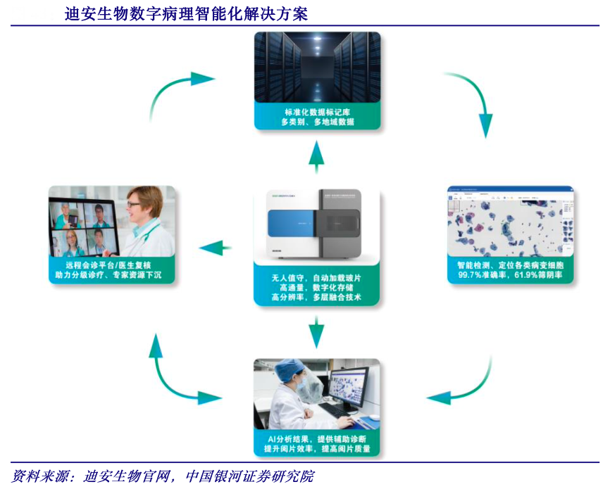 經典案例:根據迪安生物官網、中國銀河證券研究院等綜合資訊表明,迪安生物細胞病理系列產品包含以大規模兩癌篩查為主的離心式液基細胞制片系列產品,如宮頸液基細胞 AI 輔助診斷、病理科數字病理樣本庫、病理遠程平臺、 線上教學平臺等,持續打造全自動液基細胞制片染色+免疫組化染色+數字化掃描成像系統+AI 智能應用的整體解決方案。
