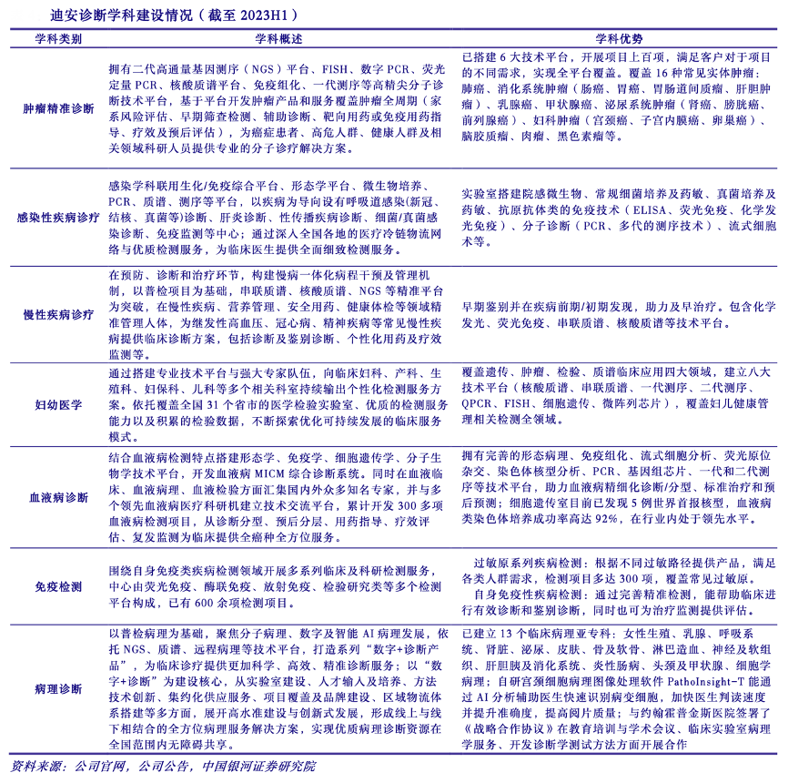 經典案例:根據公司官網、公司公告、中國銀河證券研究院等綜合資訊表明,迪安診斷公司圍繞基因、蛋白及代謝組學技術平臺,不斷升級精準中心建設,幫助醫院打造一體化精準診療,推動血液病、宏基因、甲狀腺三大產品線持續上量,并圍繞重點疾病學科與 100 多位國內知名 KOL 建立產學研及成果轉化合作,參與 11 個重大疾病專科聯盟。