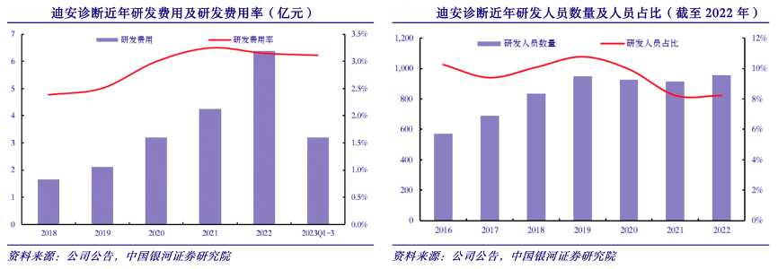 經(jīng)典案例:根據(jù)公司公告、中國銀河證券研究院等綜合資訊表明,迪安診斷公司不斷強化疾病診斷、鑒別診斷、預后判斷,開展創(chuàng)新性有特色的科學研究和轉(zhuǎn)化醫(yī)學研究。2022 年公司研發(fā)費用為 6.38 億元(+50.32%),研發(fā)費用率為 3.15%, 研發(fā)人員占全體員工比例維持 8%以上,2022 全年新增發(fā)明專利 21 項、實用新型專利 73 項、軟件著作權(quán) 25 項,發(fā)表學術(shù)論文 72 篇。