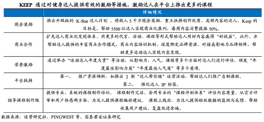 經典案例:根據運營研究社、PINGWEST、國泰君安證券研究等綜合資訊表明,KEEP公司鼓勵健身達人開發和制作健身內容,目前 PUGC 已成為非常受歡迎的內容類。截至 2022 年末,KEEP 平臺提供由健身達人、健身專業人士和內容提供商制作的約 17,800 個健身課程。