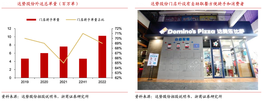 經典案例:根據達勢股份招股說明書、浙商證券研究所等綜合資訊表明,達美樂中國區別于其他比薩品牌,其依靠獨家配備的專業騎手來完成外送訂單,專業騎手常駐門店,并且僅配送公司門店訂單從而避免交叉污染,確保食品安全。同時通其進一步加強了公司 30 分鐘必達承諾的能力。