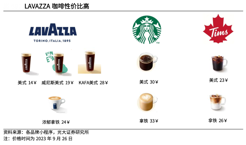 經典案例:根據各品牌小程序、光大證券研究所等綜合資訊表明,LAVAZZA 品牌調性高,主打純正意式咖啡,但從定價來看略低于星巴克和 Tims,具有較高性價比。與其他咖啡品牌相比,LAVAZZA 提供豐富的意式烘焙和特色三明治, 有利于增強消費粘性。