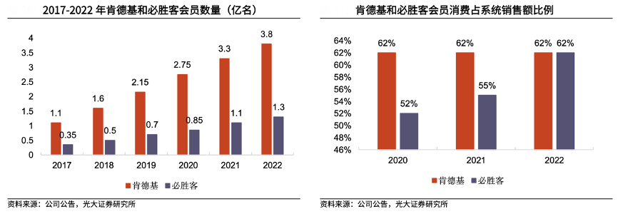 經典案例:根據公司公告、光大證券研究所等綜合資訊表明,肯德基于 2016 年開展肯德基 WOW 會員計劃,并陸續推出會員卡包、V 金商城等一系列會員專享活動。2017-2022 年期間,肯德基的會員數量由 1.1 億名穩步提升至 3.8 億名,必勝客的會員數量由 0.35 億名提升至 1.3 億名。2022 年,肯德基和必勝客的會員消費占系統銷售額的比例均達到 62%,顯現出公司在行業內具備較強會員粘性,會員復購能夠持續驅動公司業務增長。
