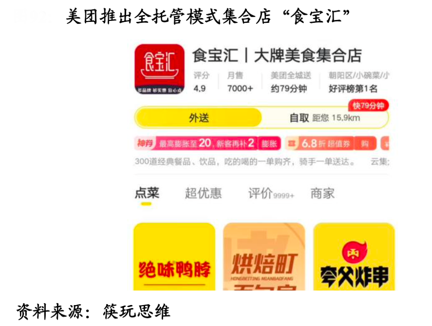 經典案例:根據筷玩思維、開源證券研究所等綜合資訊表明,美食聚合店(針對中小商戶):以貨架電商的邏輯運營外賣,是一種聚合外賣店,美團自行招募多個餐飲品牌入駐,并參與日常管理,挑選部分商品上架到聚合店鋪,消費者可在該店鋪購買多個商家提供的產品。美團希望解決中小商家外賣檔口衛生質量差、用戶不信任的問題。