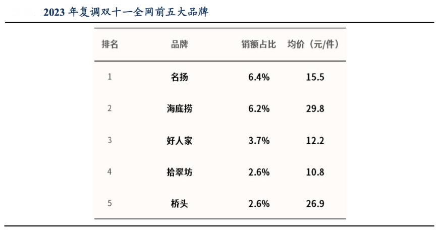 經典案例:根據星圖數據、東吳證券研究所等綜合資訊表明,四川食萃食品有限公司成立于 2007 年,旗下擁有“拾翠坊”、“面之大”、“香呷呷”三大品牌,在淘寶、天貓、京東、 抖音、微信等主流電商平臺上擁有 11 家線上店鋪,目前已為全國超過 10 萬個餐飲終端門店提供服務。2023 年雙十一食萃旗下品牌拾翠坊在全網復調中排名第四,銷售額占比 2.6%,僅次于名揚、海底撈、好人家等 C 端品牌,是復調線上小 B 龍頭。