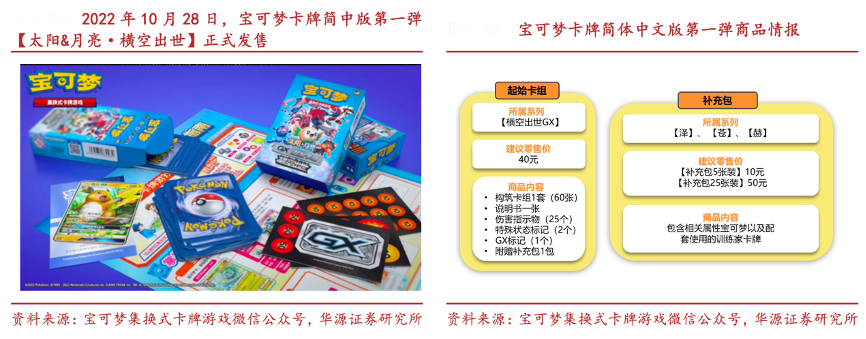 經典案例:根據寶可夢集換式卡牌游戲微信公眾號、華源證券研究所等綜合資訊表明,2022 年 10 月 28 日,寶可夢卡牌簡中版正式發售,是中國現代 TCG 開拓者和引路人。產品方面,寶可夢卡牌簡中版第一彈推出了面向新手玩家的起始卡組【橫空出世 GX】以及【赫】、【蒼】、【澤】3 款補充包。起始卡組備齊了對戰所需的基礎物品,即買即玩,補充包則包 含更多的高罕卡牌以及閃卡等。