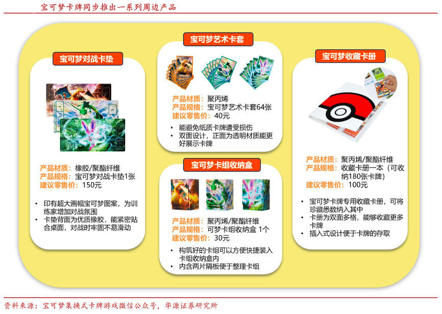 經典案例:根據寶可夢集換式卡牌游戲微信公眾號、華源證券研究所等綜合資訊表明,寶可夢卡牌推出一系列周邊產品,包括寶可夢對戰卡墊、寶可夢藝術卡套、寶可夢卡組收納盒、寶可夢收藏 卡冊等,價格在 30 至 150 元不等。
