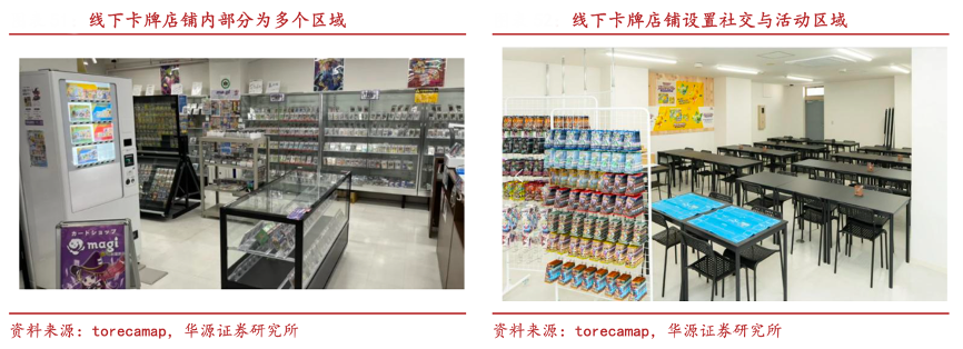 經(jīng)典案例:根據(jù)torecamap、華源證券研究所等綜合資訊表明,TCG 卡牌發(fā)展的早期階段,專門的卡牌店鋪開始在日本出現(xiàn)。這些店鋪不僅銷售卡牌,還為玩家提供了專門的卡牌區(qū)域和比賽場地,并定期舉辦卡牌比賽、交換活動以及發(fā)布會等,為玩家提供了一個社交和游戲的平臺。線下專門店鋪成為玩家社區(qū)的核心組成,通過定期 舉辦各種比賽、交流會和發(fā)布活動,線下店鋪促進(jìn)了玩家之間的互動,增強了卡牌游戲的社 群氛圍,擴大了泛游戲群體。