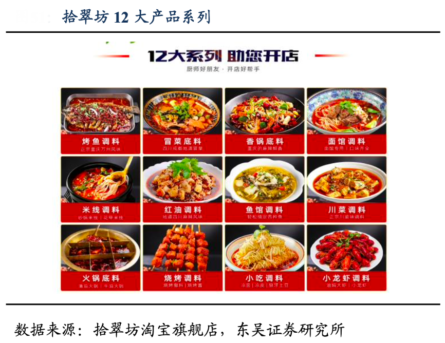 經(jīng)典案例:根據(jù)拾翠坊淘寶旗艦店、東吳證券研究所等綜合資訊表明,食萃主力品牌拾翠坊目前共有 12 大 產(chǎn)品系列,涵蓋大部分復(fù)調(diào)小 B 端整體品類,產(chǎn)品矩陣完善,能夠滿足小 B 端客戶一攬子采購需求。