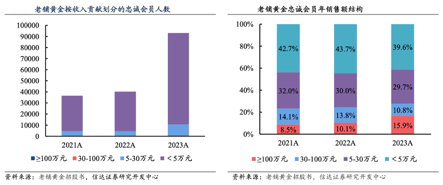 經典案例:根據老鋪黃金招股書、信達證券研究開發中心等綜合資訊表明,老鋪黃金忠誠會員人數快速增長,高級別會員銷售貢獻持續提升。2023年,在老鋪黃金購買至少一次的忠誠會員人數翻倍以上增長,達到 9.3 萬人,同比增幅 131%。其中,年消費額 100 萬 元及以上的忠誠會員貢獻了公司 15.9%的收入。