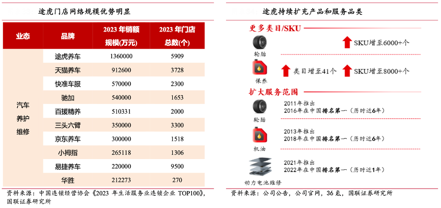 經典案例:根據中國連鎖經營協會《2023年生活服務業連鎖企業TOP100》、公司公告、公司官網、36氪、國聯證券研究所等綜合資訊表明,途虎養車公司持續擴充產品&服務品類,已達到規模效應拐點。2011 年起,途虎從輪胎切 入汽車市場,憑借規模效應,一方面做大零售規模,另一方面與全球頂尖的輪胎廠商合作低價拿貨,同時解決質量、價格等方面的用戶痛點,用 6 年年的時間成為了中國最大的替換輪胎的銷售商。