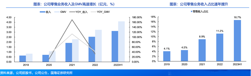 經(jīng)典案例:根據(jù)公司招股書、公司公告、國海證券研究所等綜合資訊表明,亞朵場景零售業(yè)務增長迅猛,打造亞朵特色生活方式品牌。其提供全數(shù)字化購物,僅需用手機掃描酒店產(chǎn)品即可進入自營平臺中的購買鏈接,極大優(yōu)化消費體驗。場景零售業(yè)務近年增長迅猛, 2019-2022年,零售業(yè)務規(guī)模逐年擴張,GMV/收入的年化增速分別為57.5%/58.6%,占比從4.1%提升至 11.2%。