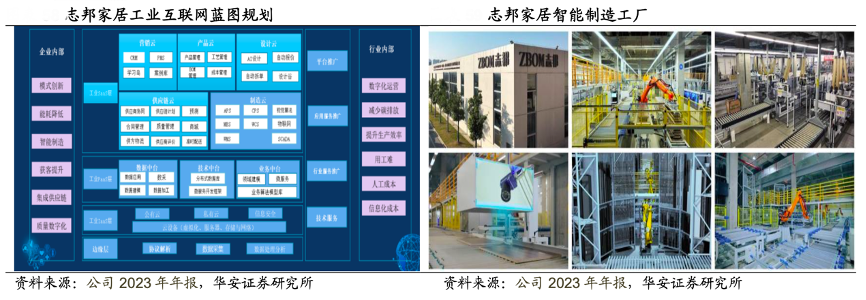 經典案例:根據公司2023年年報、華安證券研究所等綜合資訊表明,志邦家居通過制造云平臺實現計劃排產、優化、派工、調度及生產現場的綜合管控,制造物流與信息流的一致并共享,極大提升了車間的交付響應速度。通過采用智能化 等方式已實現制造產線自動化覆蓋率達80%以上,為企業人效提升、人工成本節約、提升單產線產能方面作出較大貢獻。