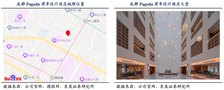 經(jīng)典案例:根據(jù)公司官網(wǎng)、攜程網(wǎng)、東吳證券研究所等綜合資訊表明,成都 Pagoda 于 2022 年 3 月 開業(yè),成都 Pagoda 大堂結(jié)合現(xiàn)代 AR 交互技術(shù),展 示林俊廷先生作品《鎏瑩》,中庭采用獨特孔明燈設(shè)計,營造中式設(shè)計氛圍。