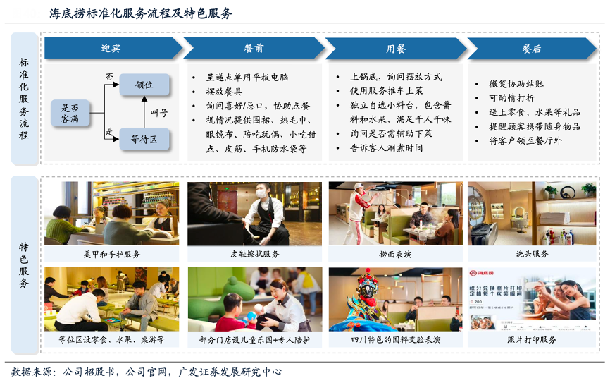 經典案例:根據公司招股書、公司官網、廣發證券發展研究中心等綜合資訊表明,本著以客為本的文化,海底撈致力于在就餐的每個環節為顧客提供周到、貼心和個性化的服務。在客人 落座后,海底撈細致入微的服務貫穿了顧客點餐、用餐的每個環節,如提供熱毛巾、圍裙、手機套、撈面表演和京劇表演等,海底撈還給予員工較大自由度,讓員工可以創造性地為顧客提供差異化服務,如為戴眼鏡的顧客提供眼鏡布,為長發顧客提 供發帶,為帶嬰兒就餐的顧客提供嬰兒床等。