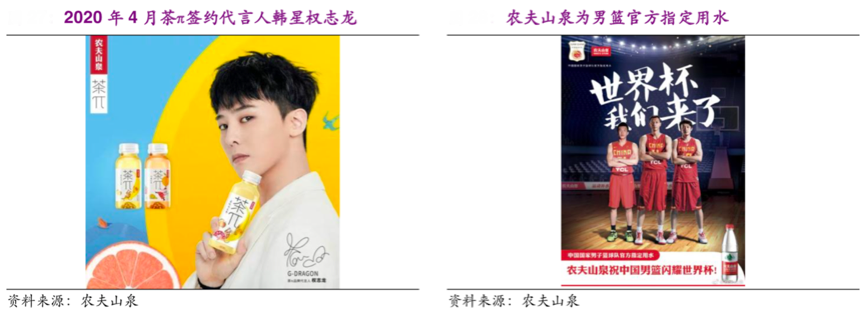 經典案例:根據農夫山泉招股說明書等綜合資訊表明,農夫山泉通過明星代言、綜藝節目植入、體育營銷、合作推廣等多種方式,不斷保持著和年輕消費者的溝通。2016 年公司推出的茶飲料 「茶π」由亞洲知名樂團Bigbang代言,品牌迅速獲得了年輕消費者的青睞。