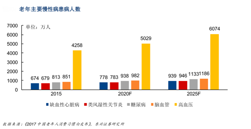 “老年人”普遍慢性病比較多,對疾病進行診斷、治療和康復等是老年人普遍關注的話題,而老年人慢性疾病的患病率在逐年上升,管理慢性疾病的成本也在增加。根據東興證券等綜合資訊表明,在 60 歲以上的老年人口中,多種慢性病共存情況較為常見,其中,高血壓、腦血管疾病、糖尿病為主要病種,也是老年消費人群關注的重要病種所在。