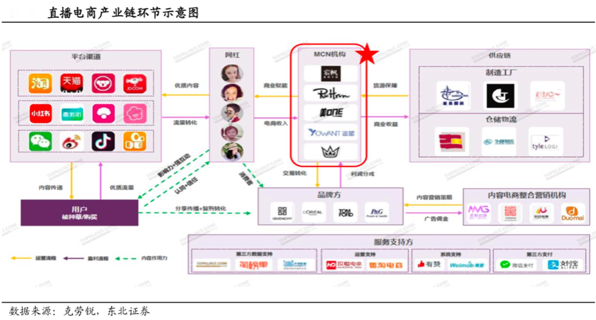 直播電商的“產(chǎn)業(yè)鏈經(jīng)營”蔚然成風(fēng),其產(chǎn)業(yè)鏈環(huán)節(jié)眾多,品牌商需要強化“直播產(chǎn)業(yè)鏈經(jīng)營”,關(guān)注主播價值挖掘、內(nèi)容營銷價值和服務(wù)支持機構(gòu)的聯(lián)動等。根據(jù)克勞銳、東北證券等綜合資訊表明,直播電商產(chǎn)業(yè)鏈環(huán)節(jié)眾多,其包括平臺、用戶、主播、MCN機構(gòu)、供應(yīng)鏈、品牌方、內(nèi)容電商整合營銷機構(gòu)和服務(wù)支持等共9個環(huán)節(jié),MCN機構(gòu)在其中占據(jù)了關(guān)鍵性產(chǎn)業(yè)地位之一。