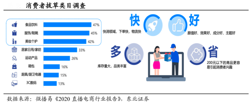 “直播電商”的品類消費傾向于低價、標準化的消費品,對價格的接受度有限,其消費場景相對固定。根據(jù)微播易《2020直播電商行業(yè)報告》等綜合資訊表明,直播電商的消費者的興趣主要集中在快消品上,對“性價比”要求較高,淘寶 2019 年人均支出在 9000 元+,快手用戶通常更青睞低價 好用的產(chǎn)品,快手 0-30 元和 30-50 元價格的產(chǎn)品較為火爆,產(chǎn)品和用戶更加下沉, 抖音用戶對價格的接受度更高,50-200 元產(chǎn)品整體均有爆款。