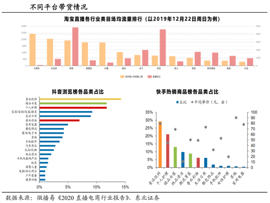 與此同時,優(yōu)秀的直播電商品牌商需要根據(jù)各平臺不同的“品類帶貨”情況,不同直播電商平臺精準匹配不同品類,以提高品類轉(zhuǎn)化率。根據(jù)微播易《2020直播電商行業(yè)報告》、東北證券等綜合資訊表明,淘寶直播的品以珠寶、穿搭等高價格品類為主,彰顯高品質(zhì)生活,有內(nèi)容、有互動,而以抖音為代表的“中心化直播平臺”則以標準化產(chǎn)品如食品飲料、精品女裝、個人護理等為主,以快手為代表的“去中心化直播平臺”則以食品飲料、個人處理等100元以內(nèi)的標準化消費品為主。